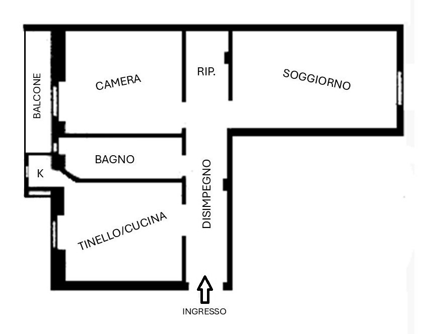 APPARTAMENTO composto da: ingresso, disimpegno, ampio tinello con cucinotto, soggiorno, camera, bagno, ripostiglio, balcone; cantina di pertinenza.