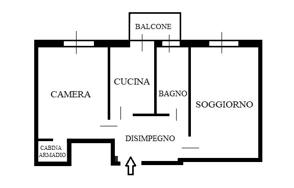 Appartamento di DUE LOCALI composto da: ingresso, disimpegno, soggiorno, cucina con balcone, camera con cabina armadio, bagno.